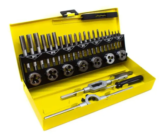 Juego de herramientas de corte que permite hacer o rectificar los hilos en tuercas y tornillos rápidamente.